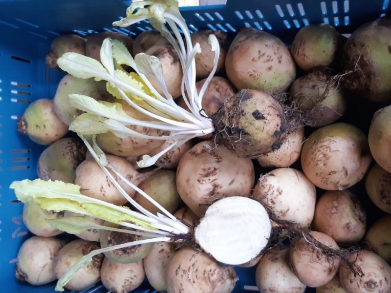 We vroegen het ons onze bietenteler Joris Kollewijn van biodynamisch tuindersbedrijf De Lepelaar. Op zijn landerijen in Sint-Maarten in Noord-Holland verbouwt hij verschillende soorten bieten, zoals de prachtige rood-wit gekleurde chioggia biet, met contrasterende witte ringen aan de binnenkant. En, sinds 3 jaar is hier ook de witte biet bijgekomen. Wat is precies het verschil?