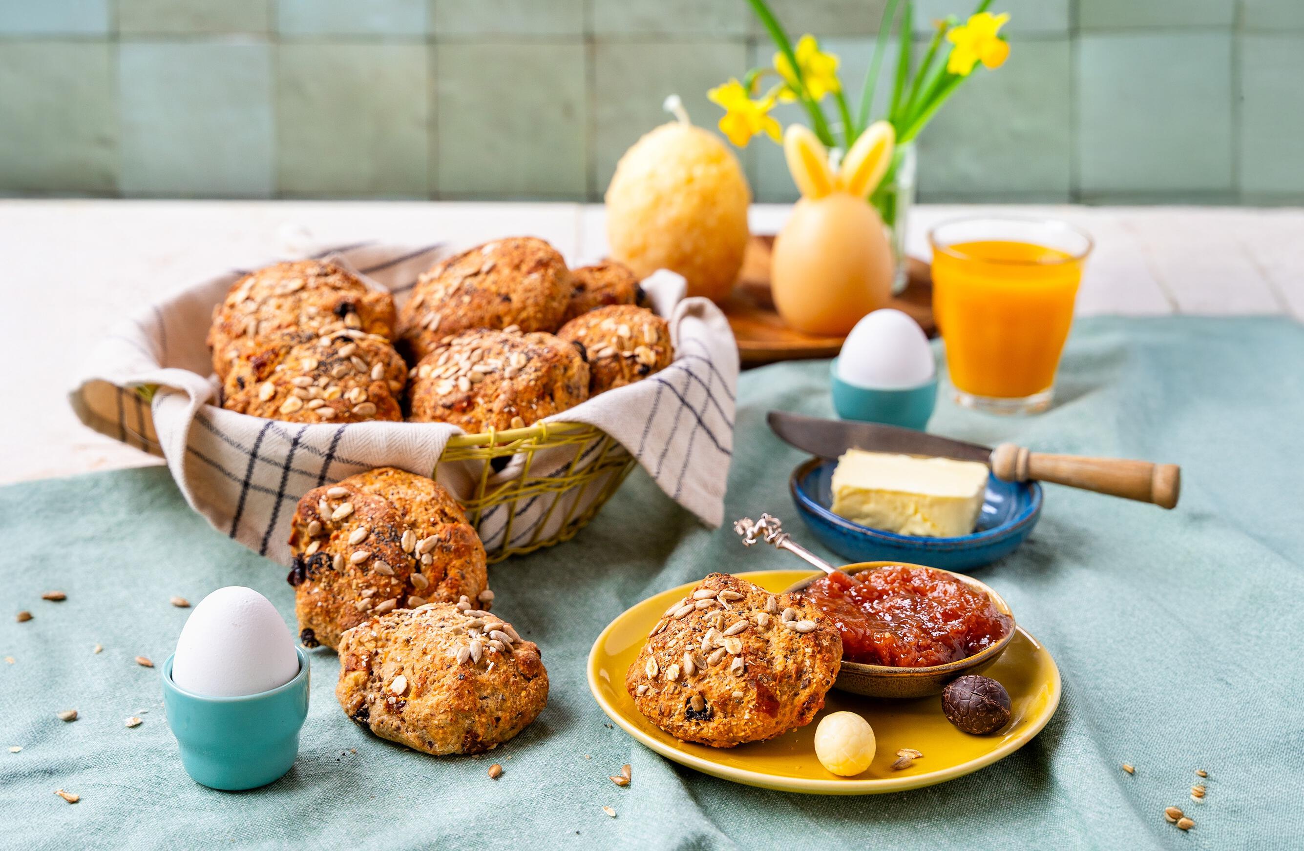 Een heerlijk Paasontbijt met Dipam-kaarsen. Kijk hier voor het recept van de mueslibolletjes met abrikoos en hazelnoot.