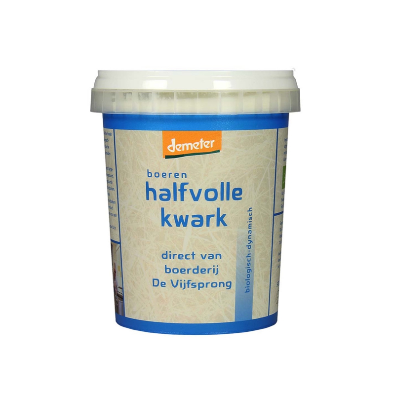Halfvolle kwark, bereid met melk van biodynamische boerderij De Vijfsprong in Vorden. Bij de bereiding wordt geen stremsel gebruikt. Op de Vijfsprong wordt de melk zo snel mogelijk na het melken verwerkt. Een groep van tussen de vier en acht hulp- en zorgvragers werken hier dagelijks onder leiding van een werkleider, verzuivelaar en kaasmaakster. De vakmensen van de Vijfsprong hebben een liefdevolle omgang met hun dieren en proberen de melk zo min mogelijk te behandelen, zodat de positieve eigenschappen zoveel mogelijk behouden blijven. Zo ontstaan bijzondere en smaakvolle levensmiddelen.