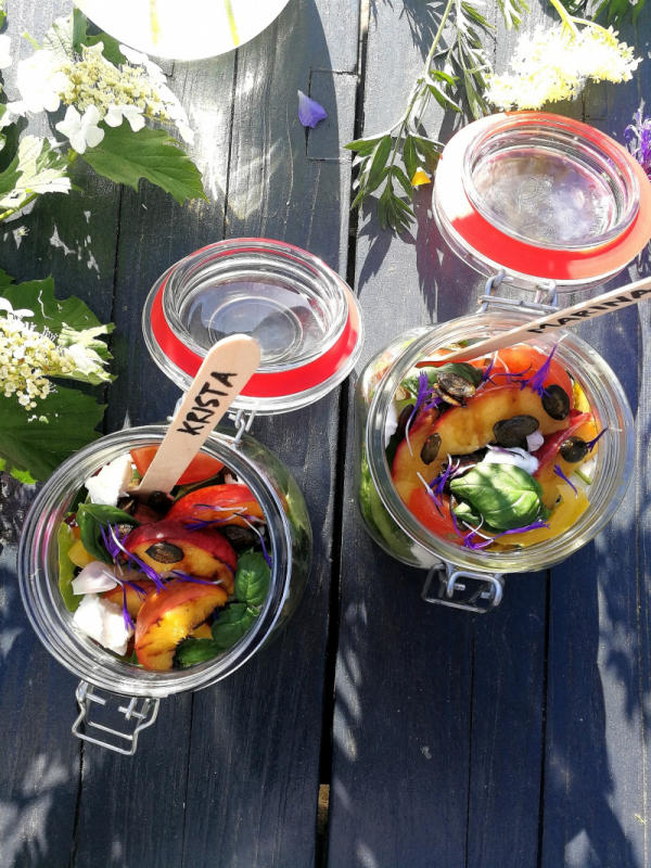 Pak de potjes en verdeel de ingrediënten. Begin met spinazie en leg de tomaatjes en de nectarines erop. Daarna wat stukjes mozzarella.