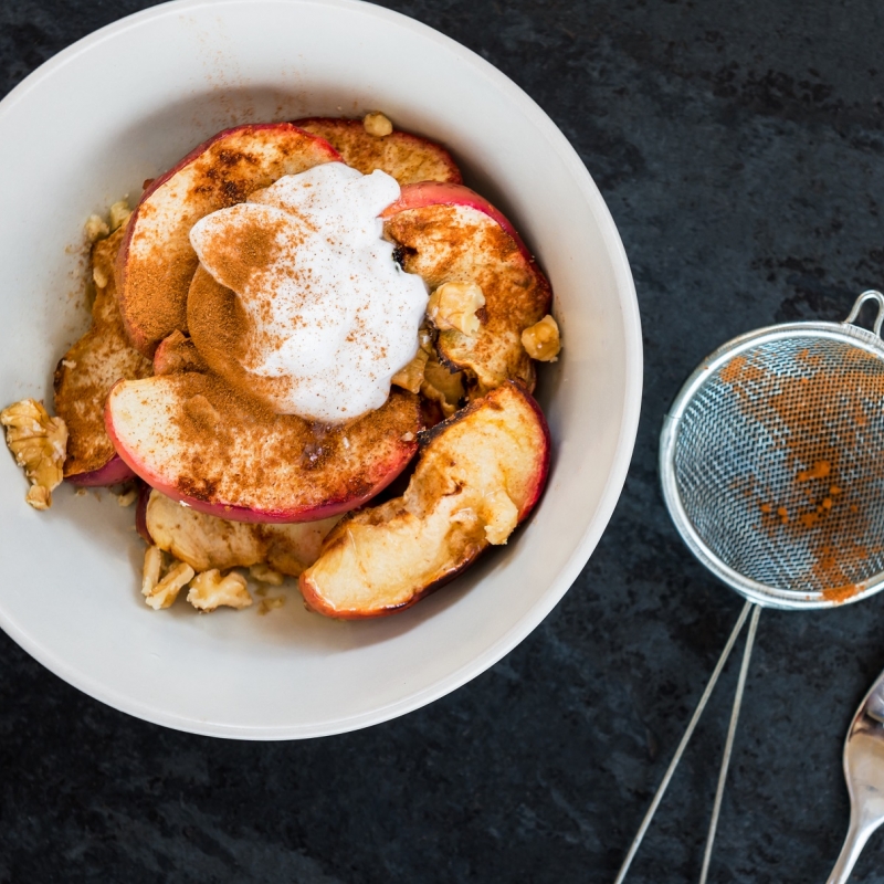 Appelschijfjes uit de oven met kaneel, gember, walnoten en slagroom. Met biologische appels het allerlekkerst!